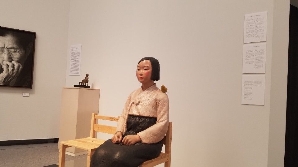 > 慰安婦問題を象徴する少女像が展示されていることに